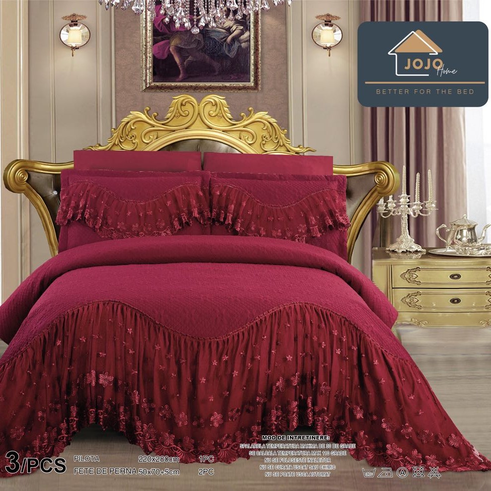 Cuvertura de pat cu volanase + 2 fete de perne confectionate din bumbac tip finet. Cuverturile de pat confectionate din bumbac finet avand volanase da cu siguranta o nota eleganta dormitorului tau si se potrivesc indiferent de sezon. Totodata, ele adauga un plus de unicitate dormitorului tau datorita broderiilor deosebite. Broderiile acestui set (cuvertura de pat plus fete de perna) sunt realizate cu ajutorul celor mai noi tehnologii – garantat nu se decoloreaza daca se respecta instructiunile de intretinere. Setul vine ambalat in husa de plastic – poate fi folosita ca husa pentru depozitare.