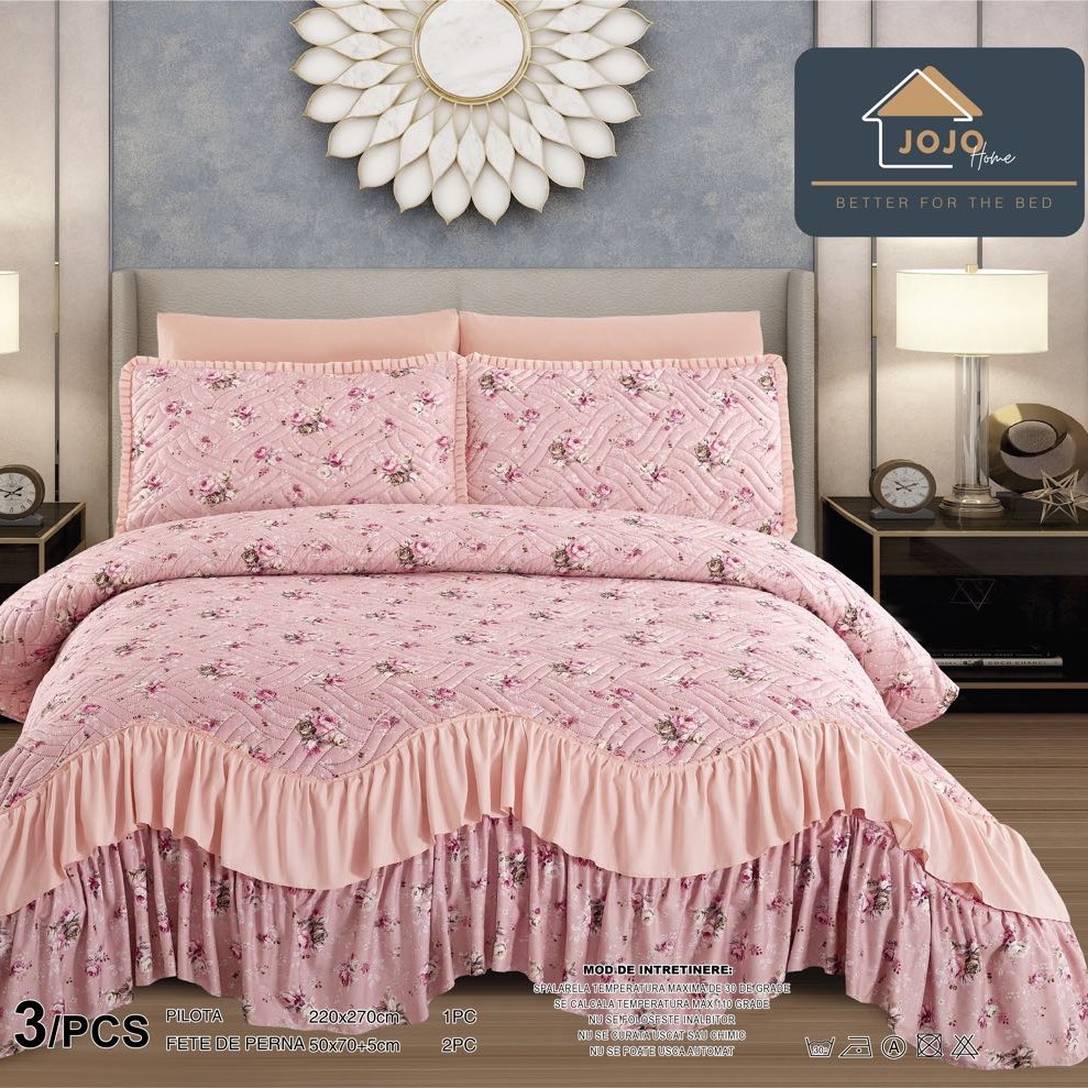 cuvertura de lux cu volanase roz Cuvertura de Lux cu Volanase, 3 Piese, Bumbac Finet - JoJo Home - PUF44245 Prețul inițial a fost: 239,99 lei.Prețul curent este: 129,99 lei.