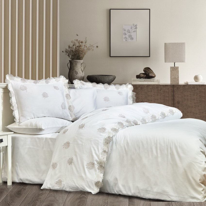 Lenjerie de pat de Lux din Bumbac 100% Satin 200TC, Pat 2 persoane – Dantela Defne Crem – PUF142865