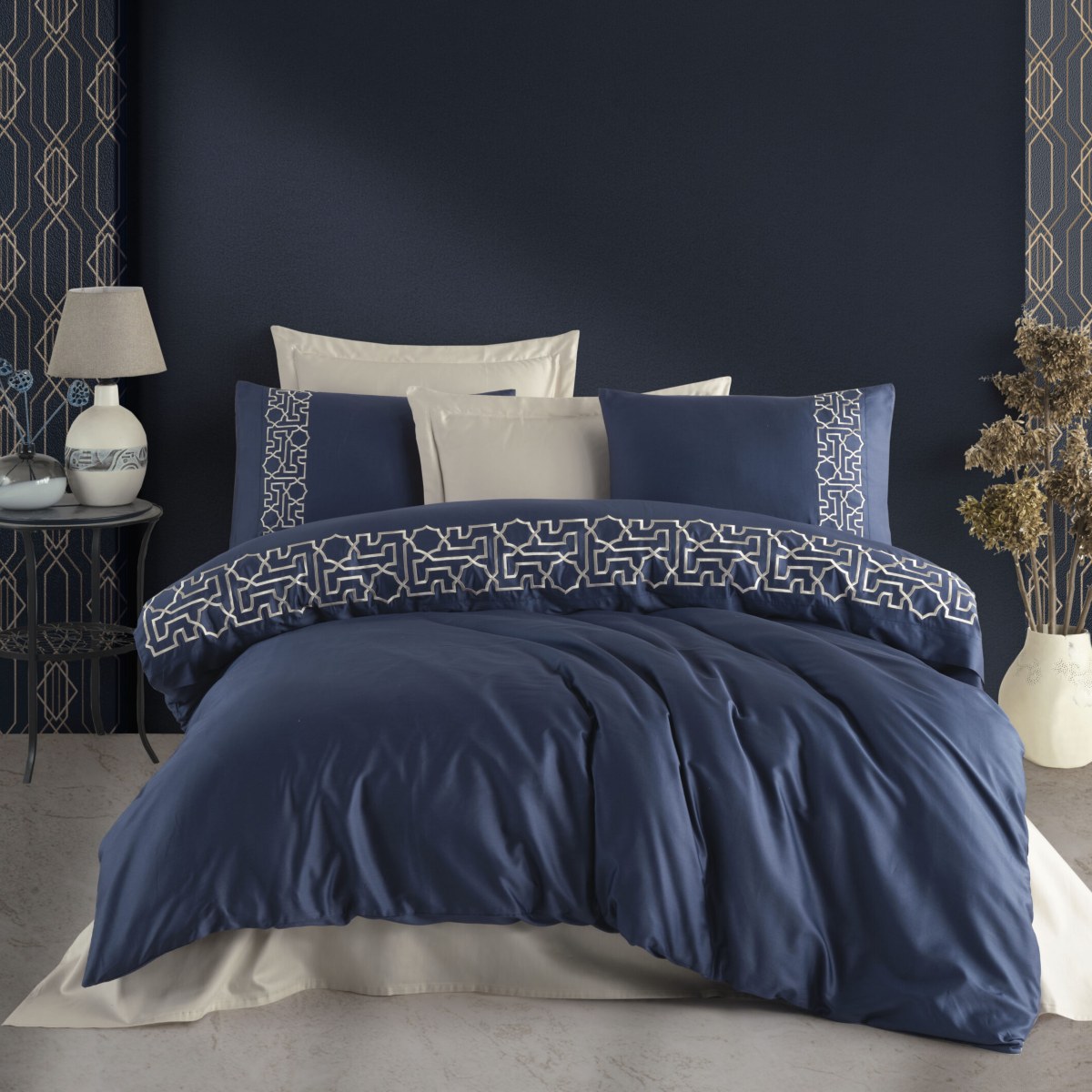 Lenjerie de pat de Lux din Bumbac 100% Satin 200TC, Pat 2 persoane – Dantela Luna – PUF142867