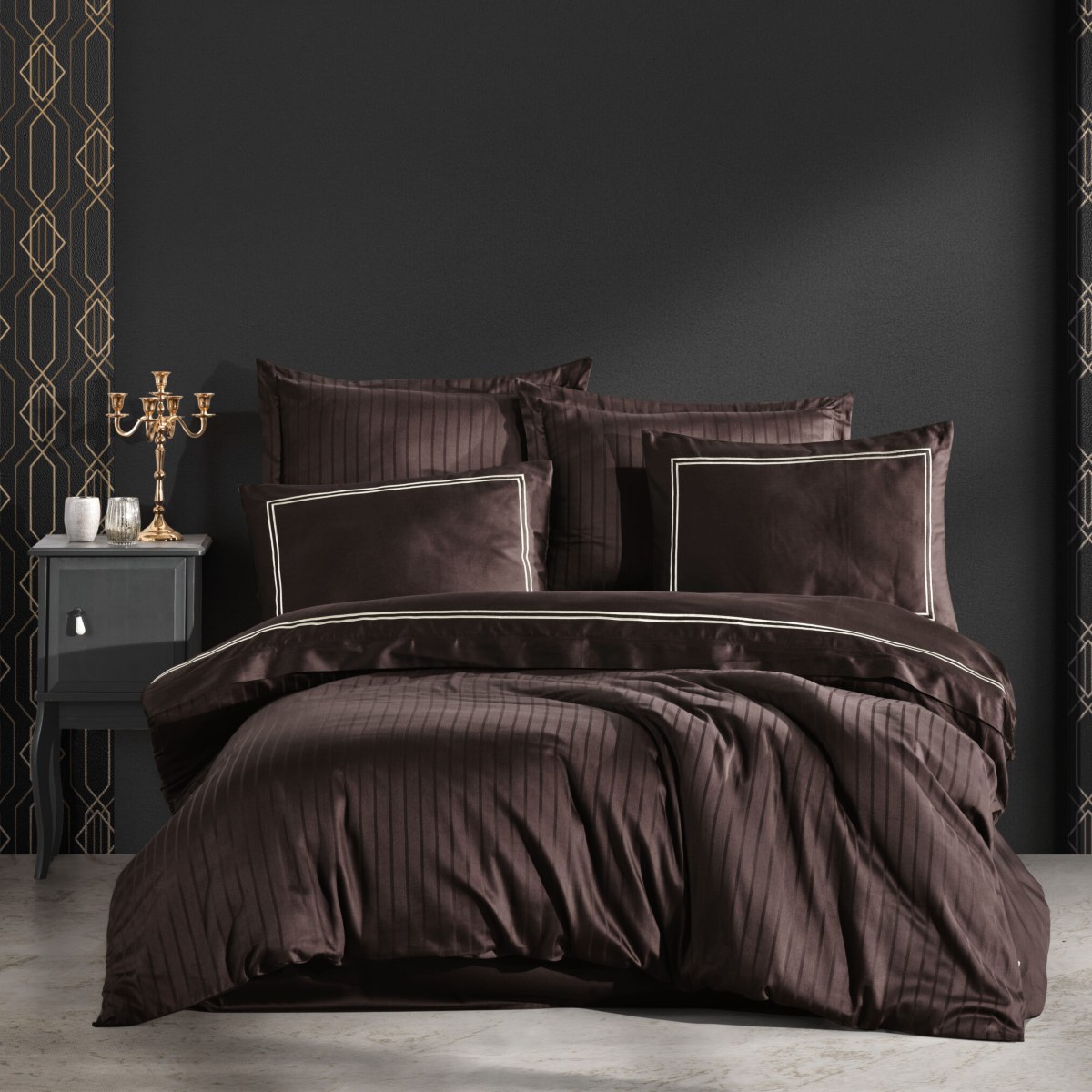 Lenjerie de pat de Lux din Bumbac 100% Satin 200TC, Pat 2 persoane – Dantela Vita Imge – Maro – PUF142834