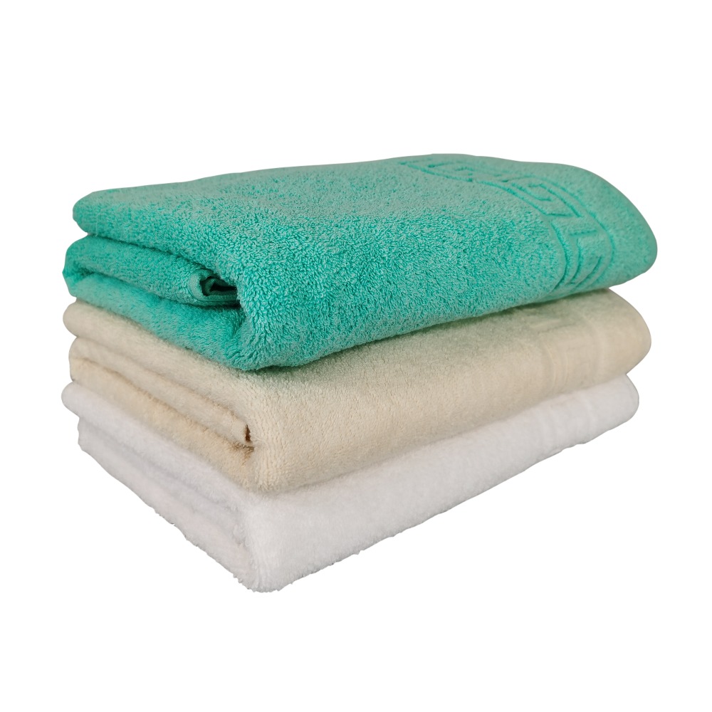 Un set de prosoape de baie mari deosebite, model grecesc(greek border) cu fir dublu rasucit, care confera o densitate si rezistenta sporita in timp; aceste calitati recomandanda produsele pentru utilizari frecvente si spalari dese, daca e necesar, chiar la temperaturi ridicate, fara a afecta calitatea sau culorile prosoapelor. Textura placuta la atingere si culoarea pot fi pastrate pentru mult timp, fara a necesita tratamente speciale, chiar si acasa, cu spalare la masina de spalat. Prosoapele sunt produse dintr-un bumbac de cea mai buna calitate, in gramaj mare.