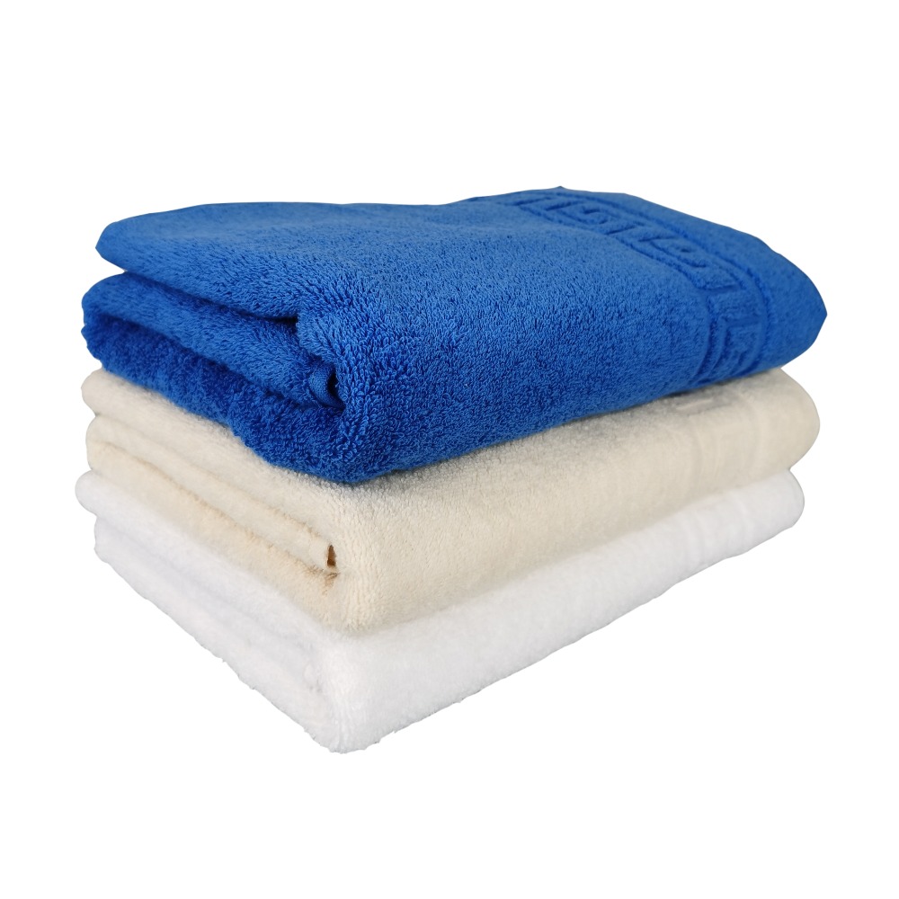 Un set de prosoape de baie mari deosebite, model grecesc(greek border) cu fir dublu rasucit, care confera o densitate si rezistenta sporita in timp; aceste calitati recomandanda produsele pentru utilizari frecvente si spalari dese, daca e necesar, chiar la temperaturi ridicate, fara a afecta calitatea sau culorile prosoapelor. Textura placuta la atingere si culoarea pot fi pastrate pentru mult timp, fara a necesita tratamente speciale, chiar si acasa, cu spalare la masina de spalat. Prosoapele sunt produse dintr-un bumbac de cea mai buna calitate, in gramaj mare.