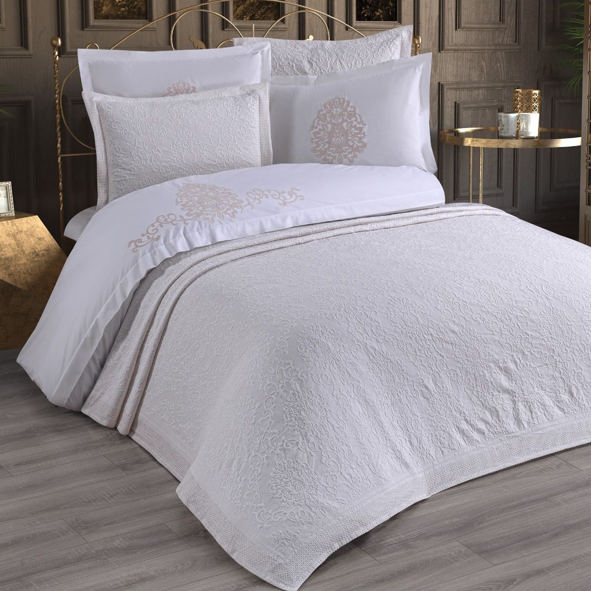 Set 9 Piese: Cuvertura de Lux + Lenjerie Bumbac 100% Poplin cu Broderie, Pat 2 Persoane – Jado Damask – Crem