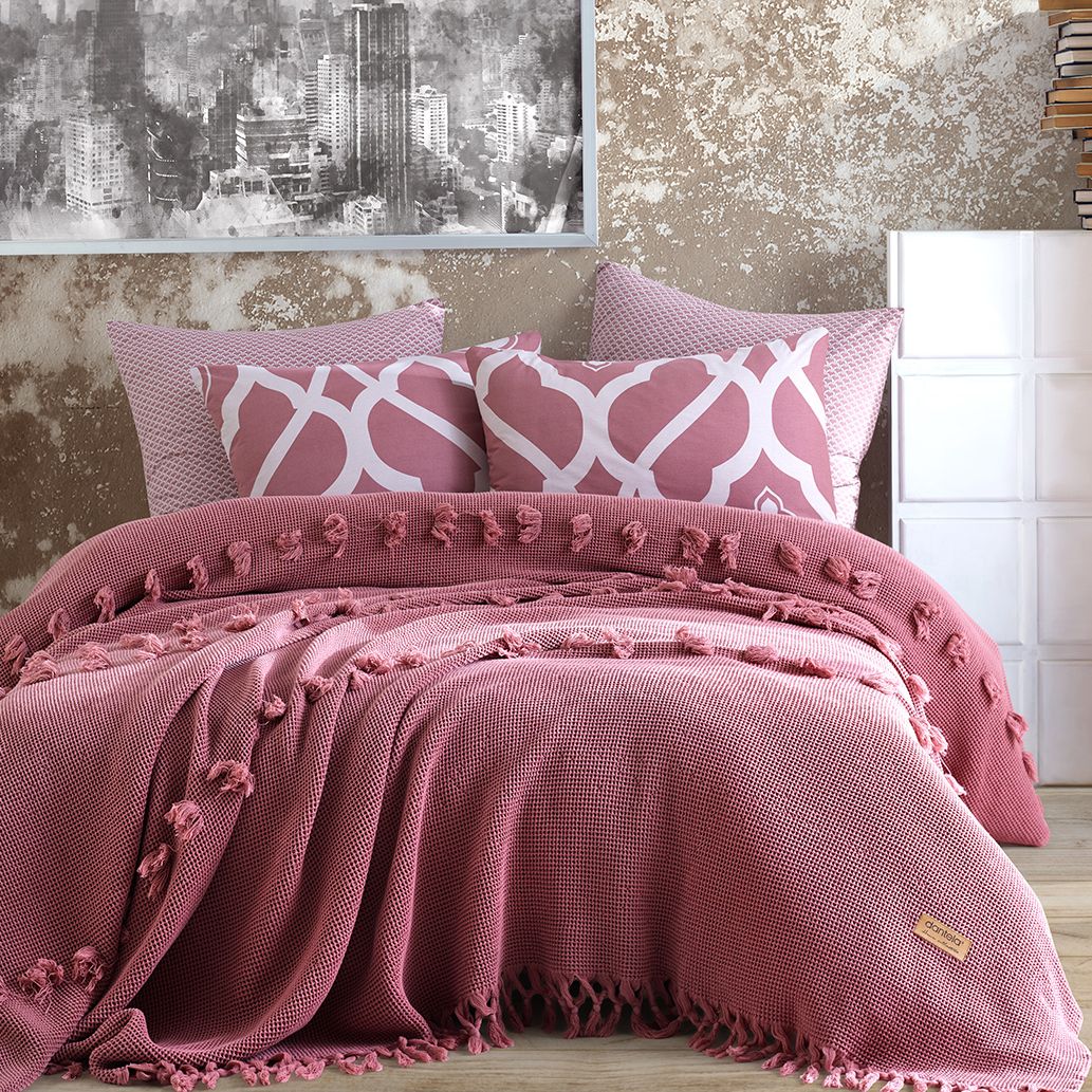 Cuvertura de pat dublu(2 persoane) confectionata din bumbac organic de cea mai buna calitate, ornata cu ciucurasi.