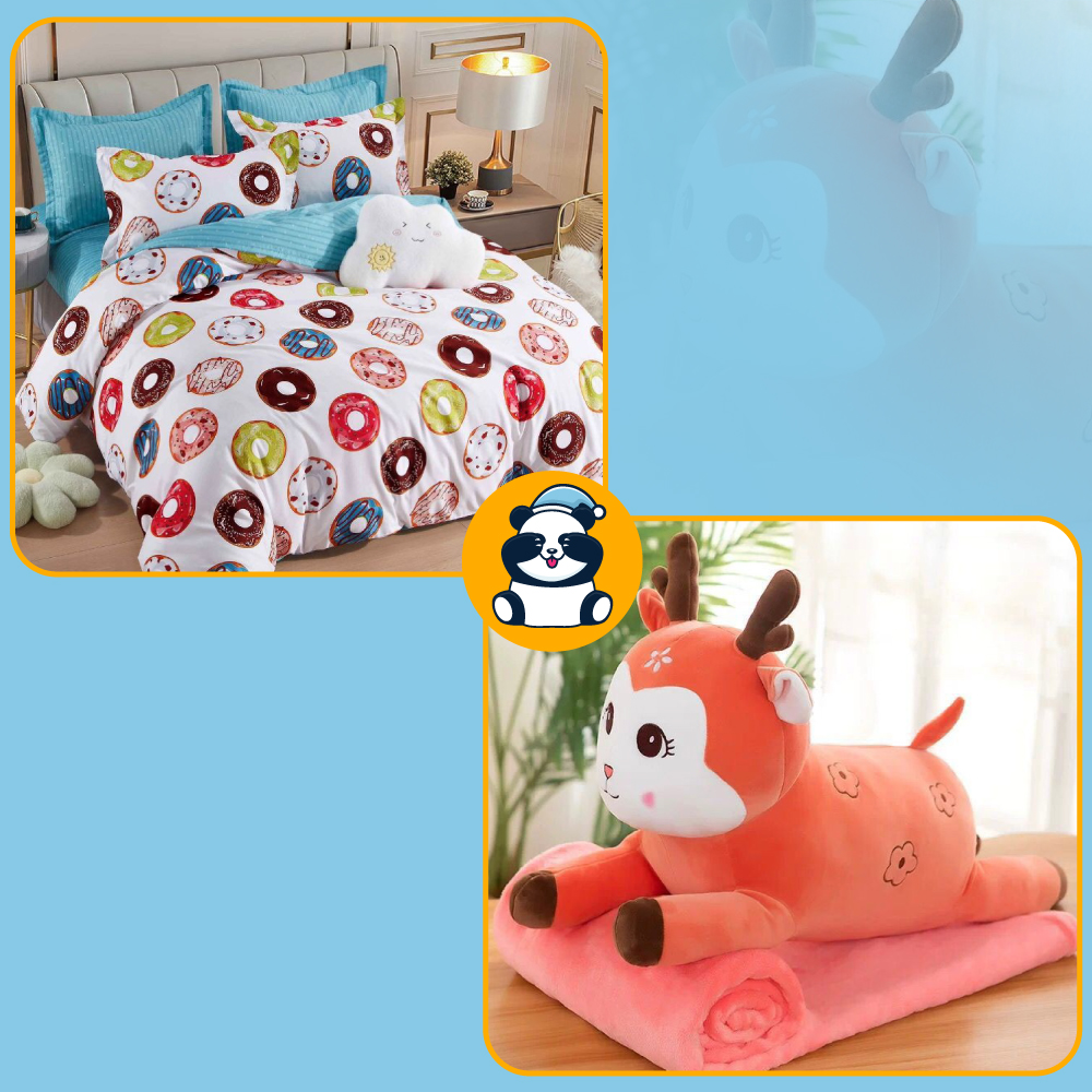 - Set cadou pentru copii Pufulino: Perna 40 x 35 cm+ Pătură 180 x 105 cm. Perna decorativa detine la interior umplutura de puf siliconizat antialergic si celuloza, iar patura Cocolino pufoasa este realizata din microfibra plusata.