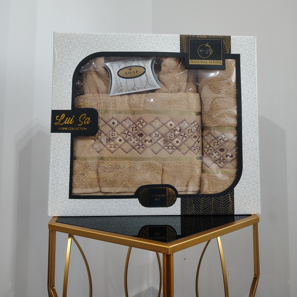 Set cadou alcatuit din 4 piese marca Luisa care contine produse de calitate ridicata, confectionate din materiale organice. Halatul de baie si prosoapele sunt confectionate din bumbac organic moale, puternic absorbant, ce ofera un inalt nivel de confort. Marimea universala a halatului si prezenta cordoanelor pentru fixare ii ofera un grad sporit de versatilitate, fiind ideal pentru a-l face cadou oricarei persoane dragi din viata voastra.