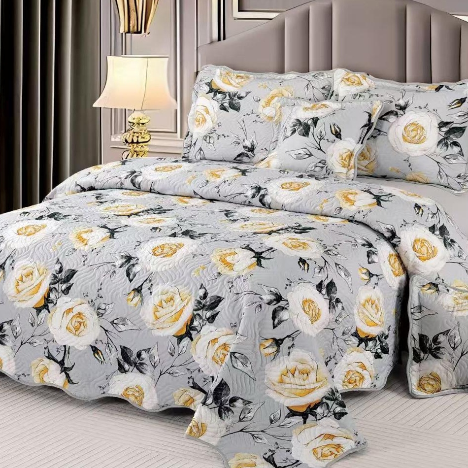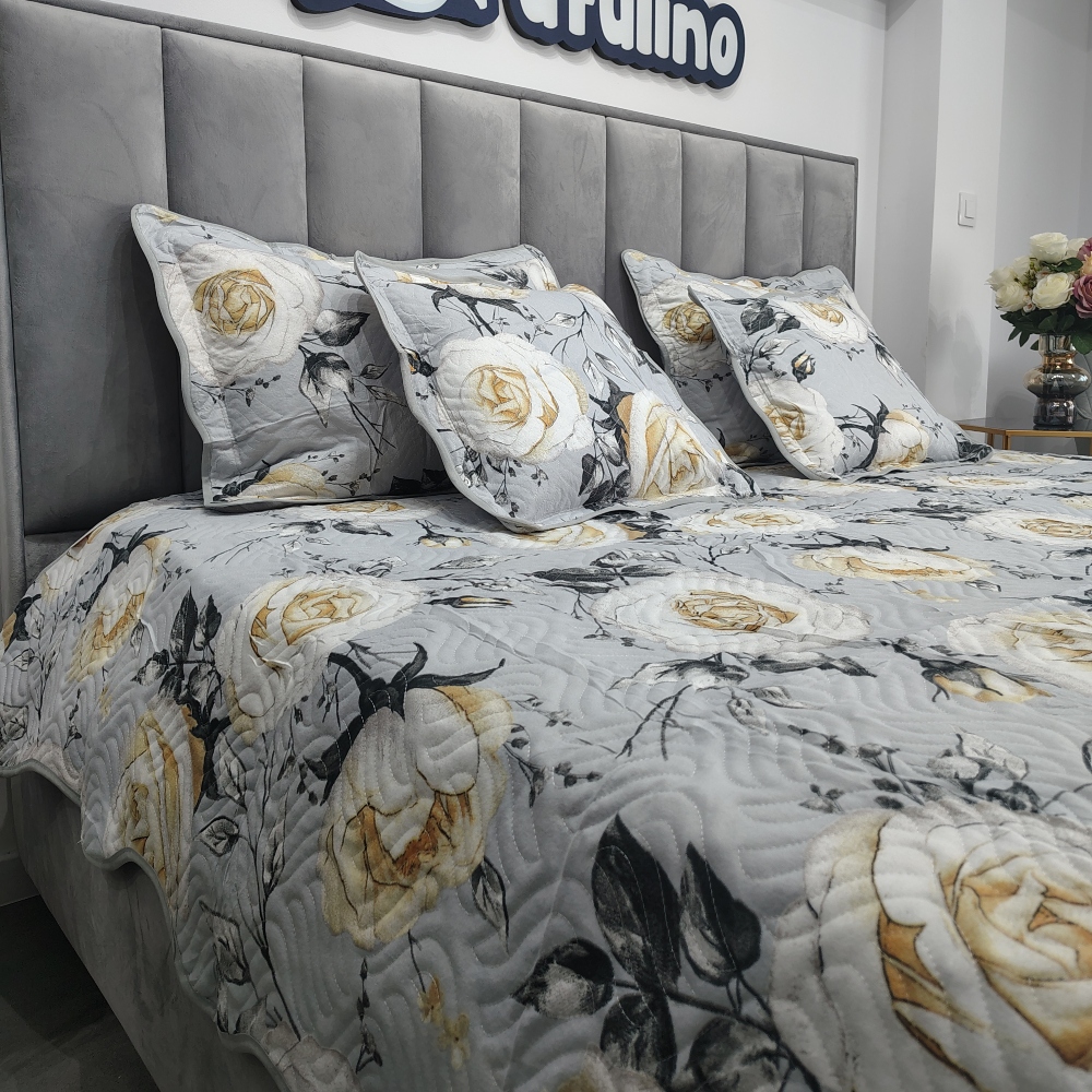 Cuvertura de pat + 4 fete de perne confectionate din bumbac. Cuverturile de pat sunt potrivite pentru orice anotimp. Totodata, ele adauga un plus de unicitate dormitorului tau prin imprimeul deosebit. Imprimeul acestui set (cuvertura pat plus fete de perna) este realizat cu cele mai noi tehnologii – garantat nu se decoloreaza daca se respecta instructiunile de intretinere. Setul vine ambalat in husa de plastic – poate fi folosita ca husa pentru depozitare.