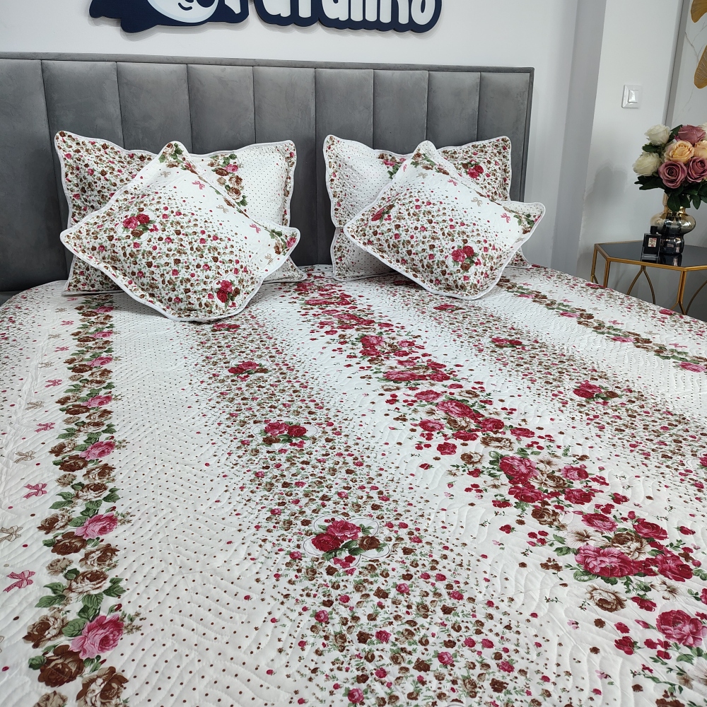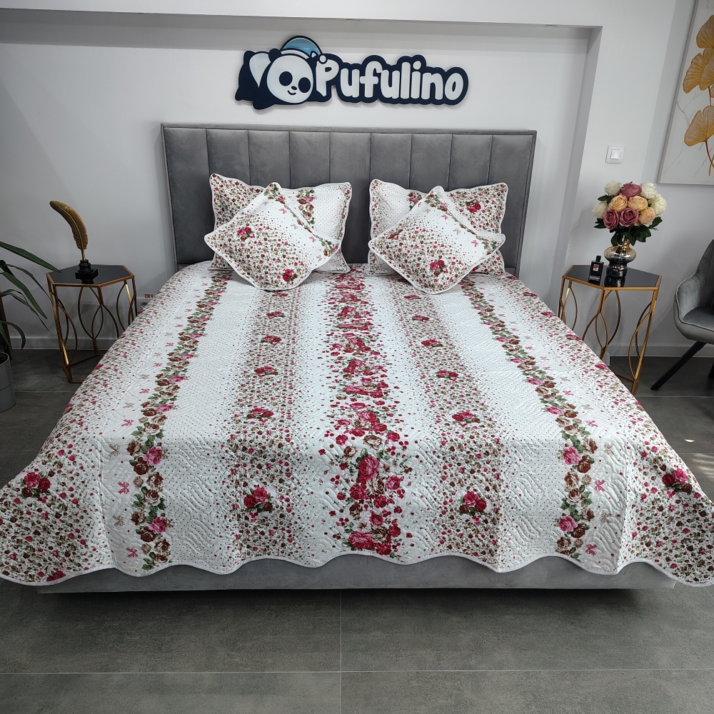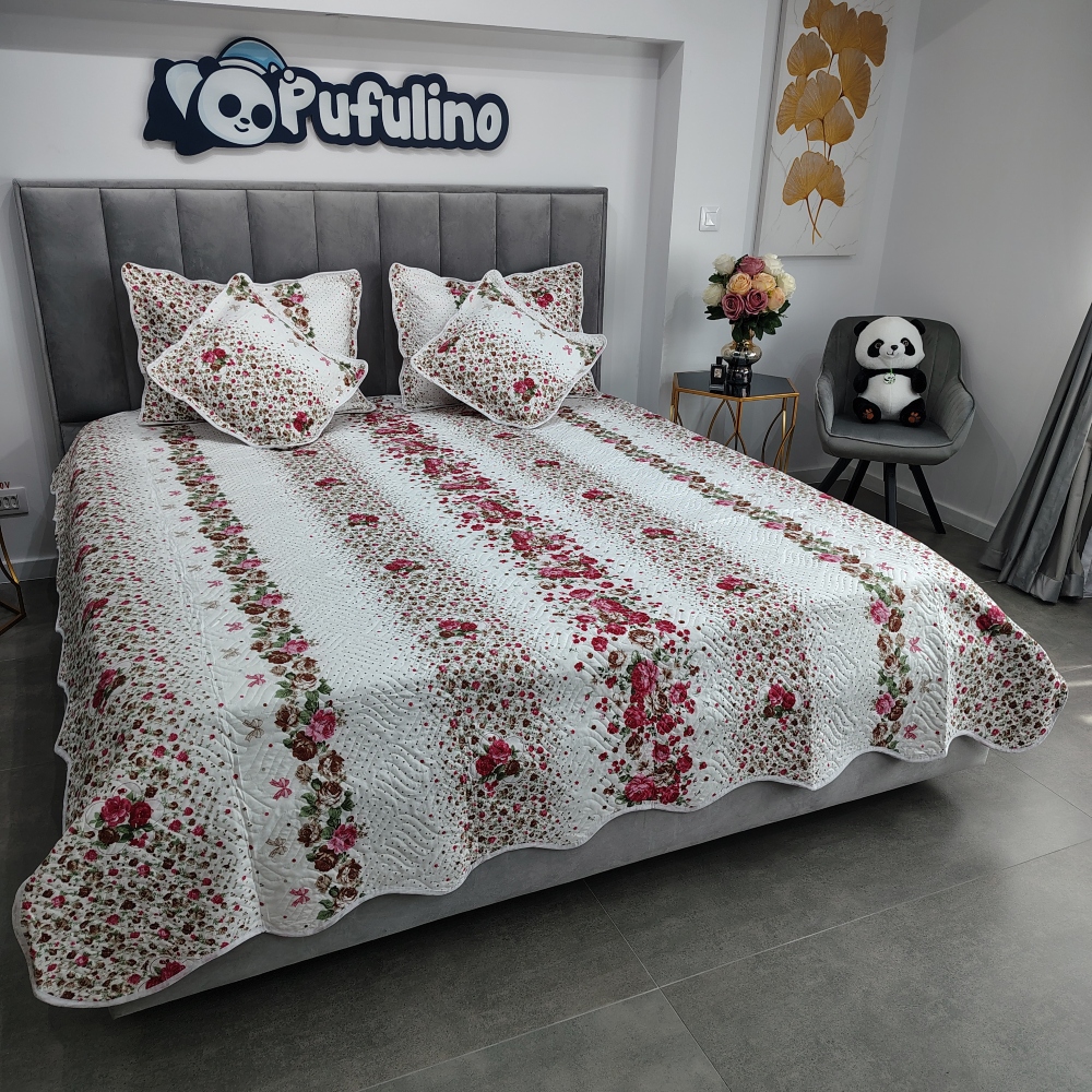 Cuvertura de pat + 4 fete de perne confectionate din bumbac. Cuverturile de pat sunt potrivite pentru orice anotimp. Totodata, ele adauga un plus de unicitate dormitorului tau prin imprimeul deosebit. Imprimeul acestui set (cuvertura pat plus fete de perna) este realizat cu cele mai noi tehnologii – garantat nu se decoloreaza daca se respecta instructiunile de intretinere. Setul vine ambalat in husa de plastic – poate fi folosita ca husa pentru depozitare.