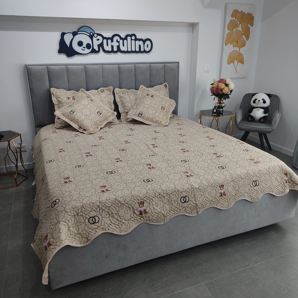 Cuvertura de pat + 4 fete de perne confectionate din bumbac. Cuverturile de pat sunt potrivite pentru orice anotimp. Totodata, ele adauga un plus de unicitate dormitorului tau prin imprimeul deosebit. Imprimeul acestui set (cuvertura pat plus fete de perna) este realizat cu cele mai noi tehnologii – garantat nu se decoloreaza daca se respecta instructiunile de intretinere. Setul vine ambalat in husa de plastic – poate fi folosita ca husa pentru depozitare.