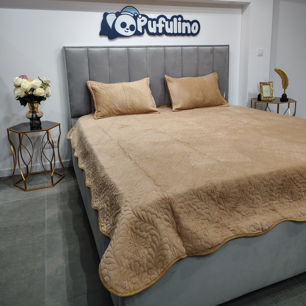 Set Cuvertura de Pat din Catifea, Bej, 3 Piese, Pat 2 Persoane – Casa Pucioasa – PUF18725
