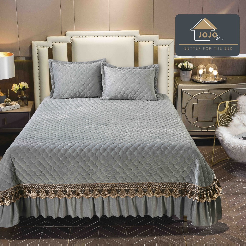 Set Cuvertura de Pat din Catifea cu Broderie, 3 Piese, 230×250cm, JoJo Home – Gri – PUF92727