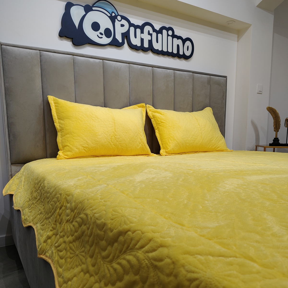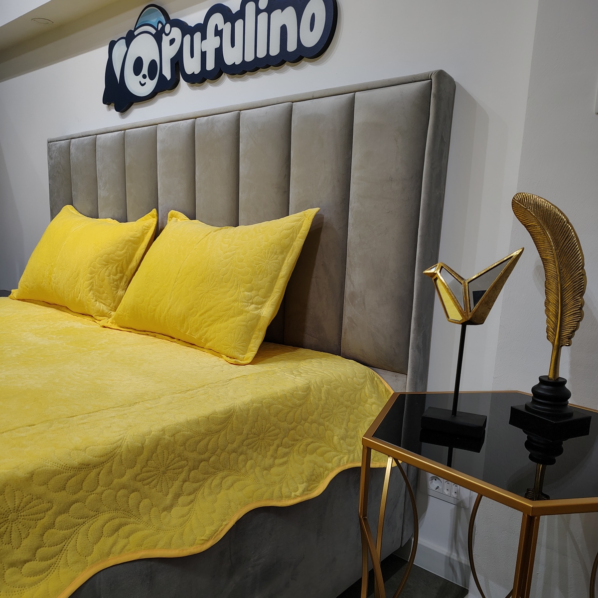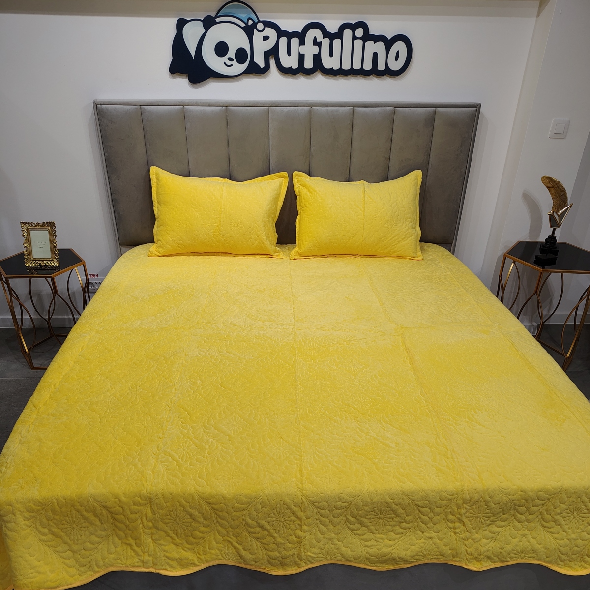 Set Cuvertura de Pat din Catifea, Galben, 3 Piese, Pat 2 Persoane – Casa Pucioasa – PUF175642