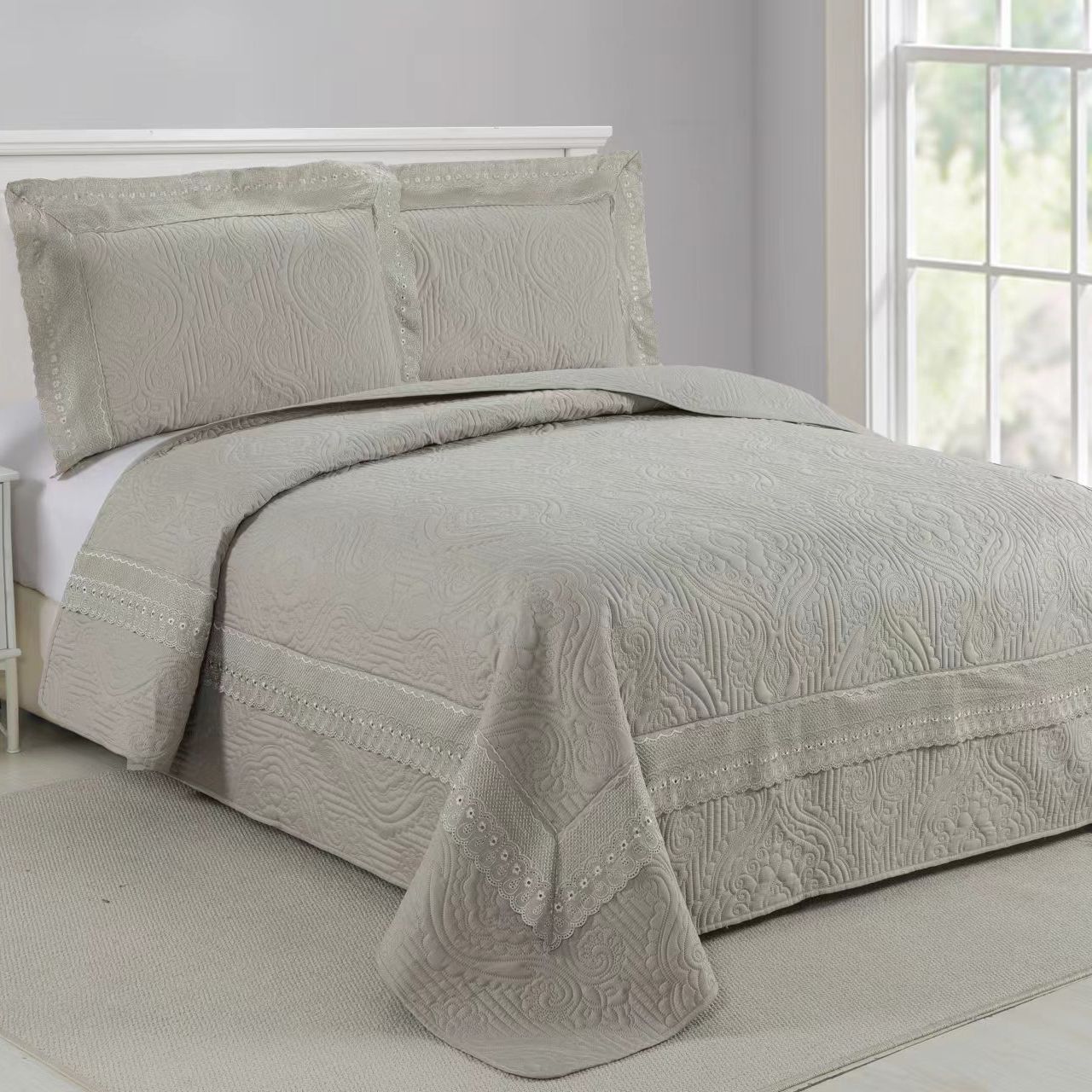 Set Cuvertura de Pat Matlasata cu Broderie, 3 Piese, 220×240 Cm – Casa de Vis – Grej – PUF139221-14