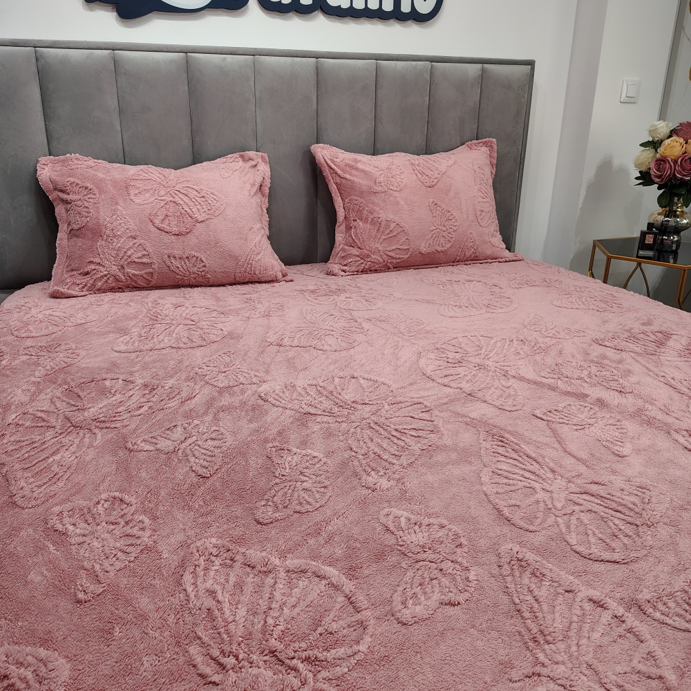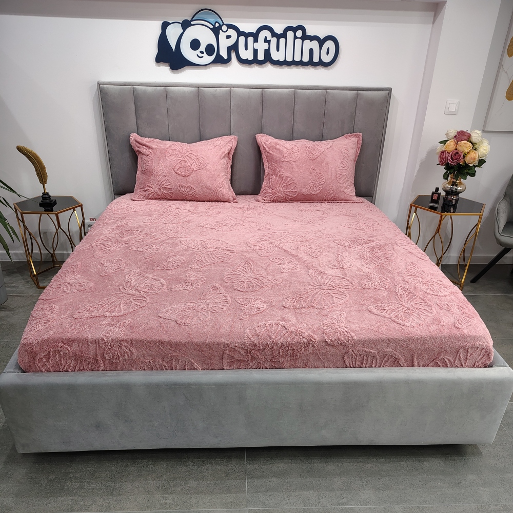 Set Husa Cocolino cu Elastic Model Tricot cu Fluturi + 2 Fete de Perna, Pat 2 Persoane, East Comfort – Pudra – PUF210092