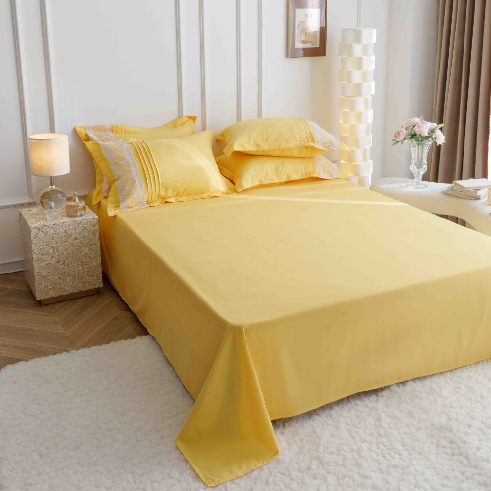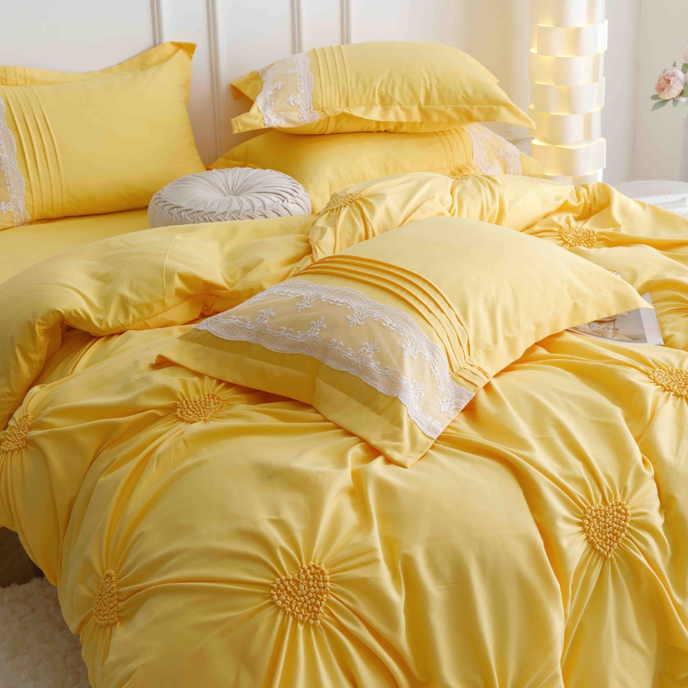 Set Lenjerie de Pat Brodata, Pliuri & Inimioare, Bumbac Soft Touch, 6 Piese, Pat Dublu – Galben – PUF91044