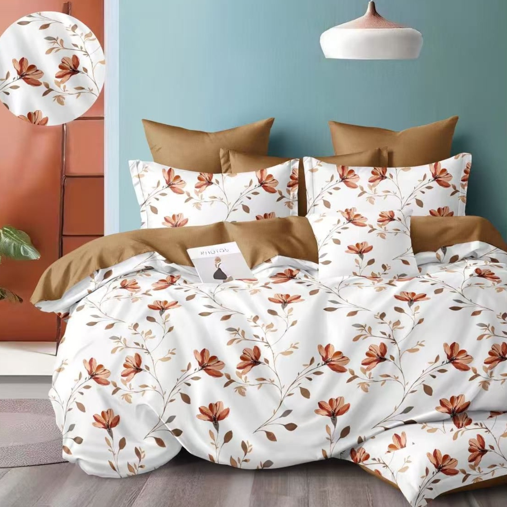 Set Lenjerie de Pat din Finet, Cearceaf cu Elastic, 6 Piese, Pat 2 Persoane Small Brown Flowers – Sky Home – PUF204025