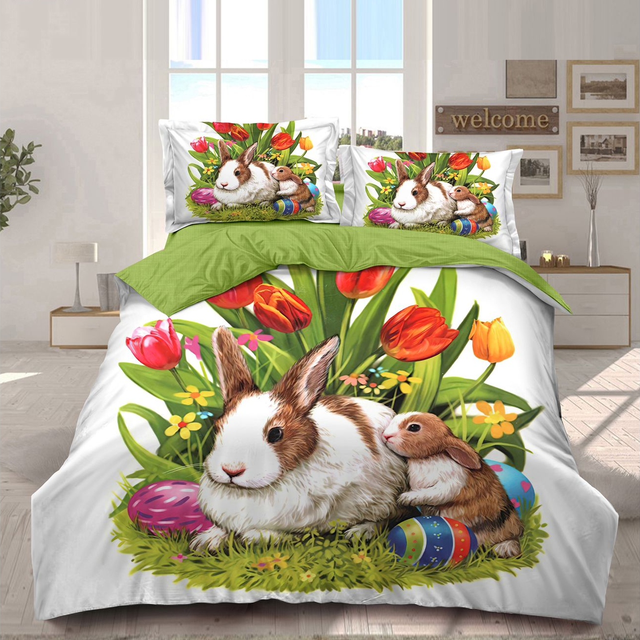 lenjerie de paste model 8 - verde cu iepuras vesel si floricele Set Lenjerie Finet Gros, 6 Piese, Pat 2 Persoane, Model de Paste - Green, Green World - PUF190620-B8 Prețul inițial a fost: 189,00 lei.Prețul curent este: 129,00 lei.
