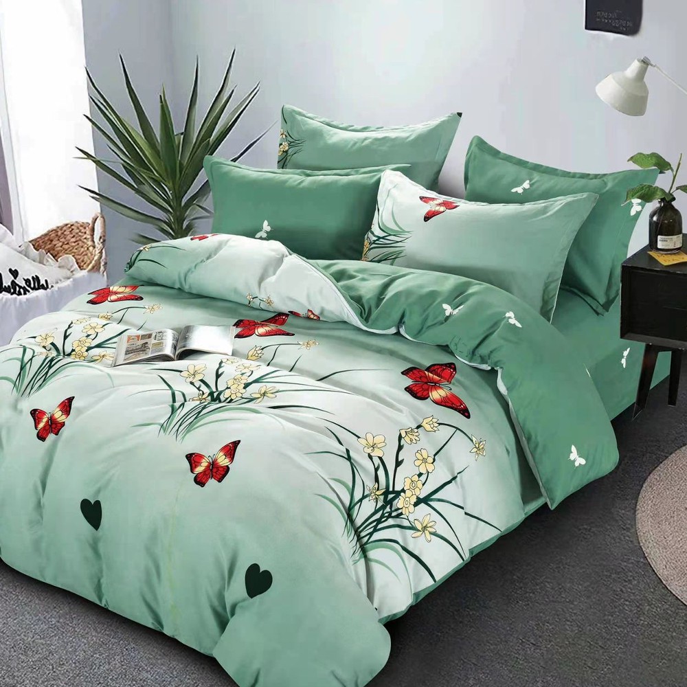 Set Lenjerie Finet Gros, 6 Piese, Pat 2 Persoane, Verde cu Fluturi – Sky Home – PUF37095