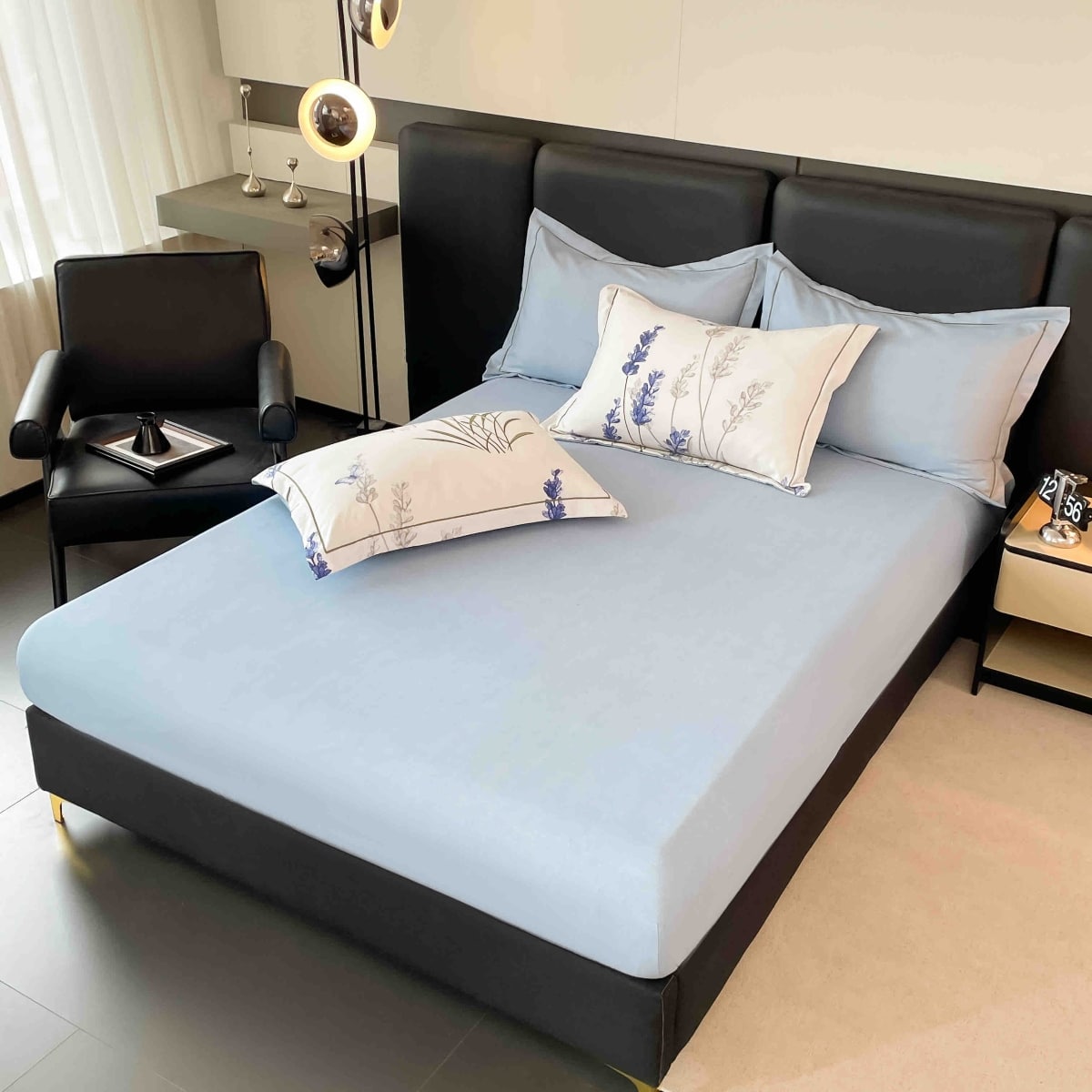 Lenjeria dispune de 6 piese si este conceputa pentru a fi utilizata pe paturile matrimoniale. Cearceaful cu elastic, model uni, este special conceput pentru a va oferi intreg confortul necesar in timpul somnului, sistemul inteligent de prindere fiind ideal pentru toate tipurile de saltele(maxim 30cm inaltime).
