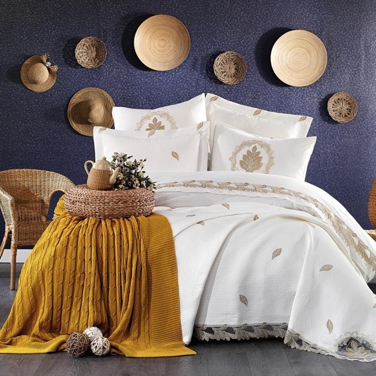 Set Luxury Alya: Lenjerie + Cuvertura + Patura, 8 Piese, Pat 2 Persoane – Alçeyiz Home – Crem/Mustar – PUF58200