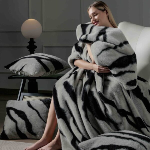 Set Pătură de Lux cu Fermoar din Blana Artificiala de Nurca + 2 Fete de Perna, Pat 2 Persoane, 200 x 230cm – Zebra – PUF183594-01