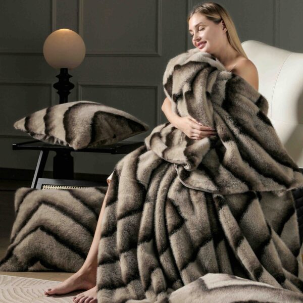 Set Pătură de Lux cu Fermoar din Blana Artificiala de Nurca + 2 Fete de Perna, Pat 2 Persoane, 200 x 230cm – Zigzag – PUF183627-06